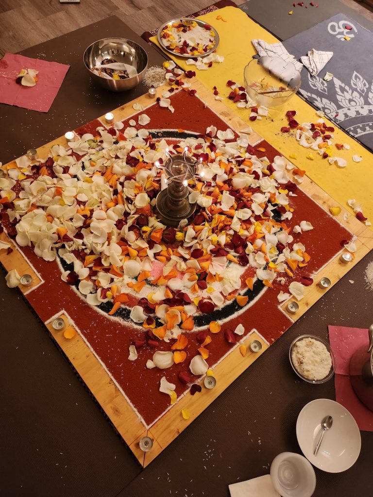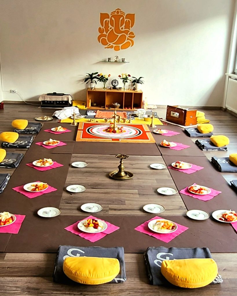 Unsere fleißigen Sevakas haben den Ganesharaum wunderbar vorbereitet damit sich all unsere Gäste an der Puja beteiligen können: Rosenblätter und Reiskörner wurden dargebracht als Dank für unser Wohlergehen und Schutz in diesen unruhigen Zeiten.